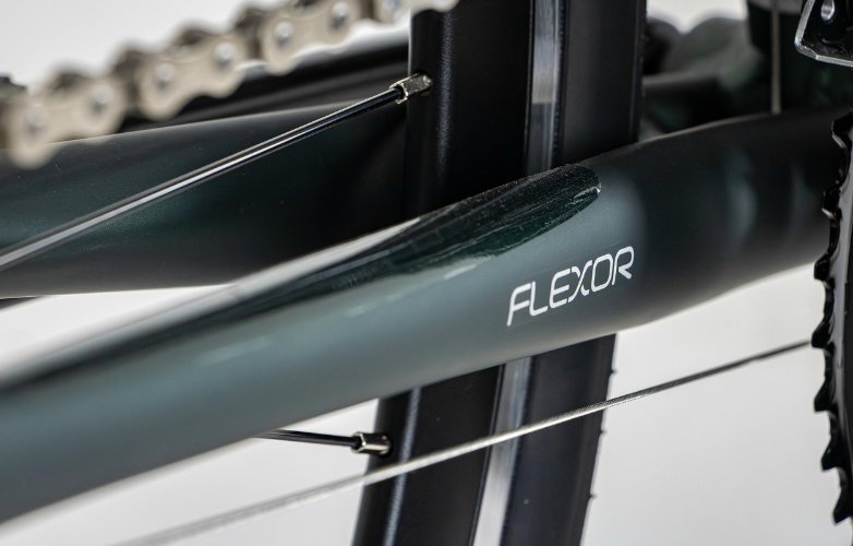 フレームのシートステーとチェーンステーを横扁平に加工する「FLEXOR」を採用。これにより、シートステーとチェーンステーが構成するリヤトライアングルが走行時に縦方向にしなり、路面の凹凸に対してフレーム自体が柔軟に対応・変形することで振動吸収性と快適性が向上した。